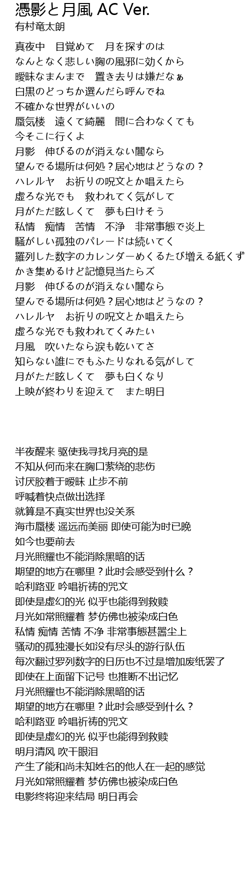 | [01:38.74] | 月がただ眩しくて 夢も白けそう |