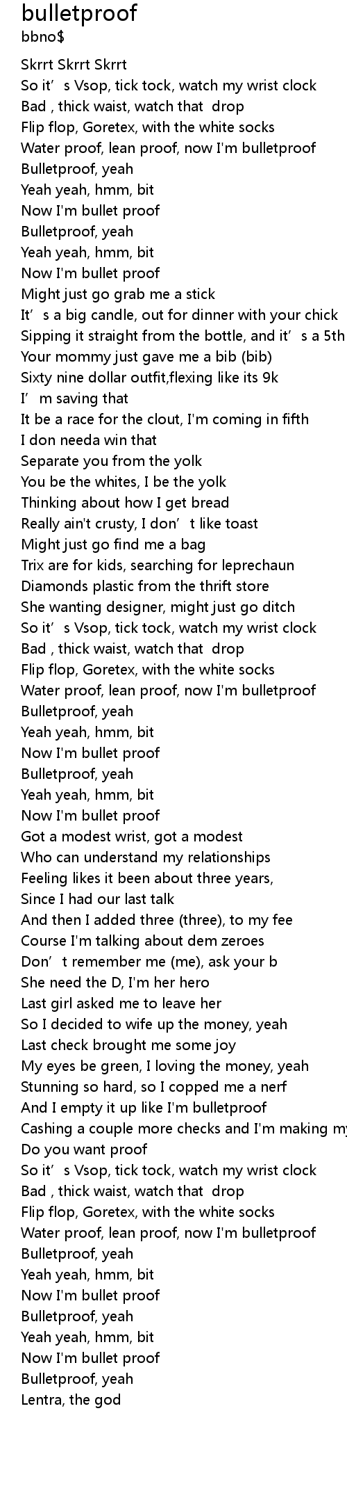 | [00:22.98] | Water proof, lean proof, now I'm bulletproof |