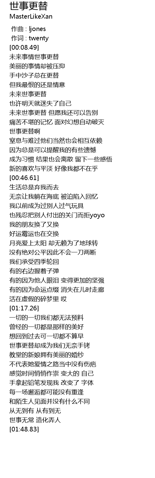 | [00:29.78] | 未来世事更替 但愿我还可以告别 |