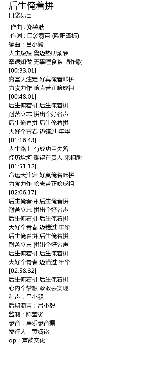 | [01:01.68] | 后生俺着拼 后生俺着拼 |