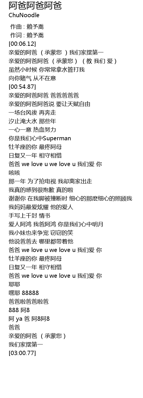 | [00:55.87] | 亲爱的阿爸阿爸 爸爸爸爸爸 |