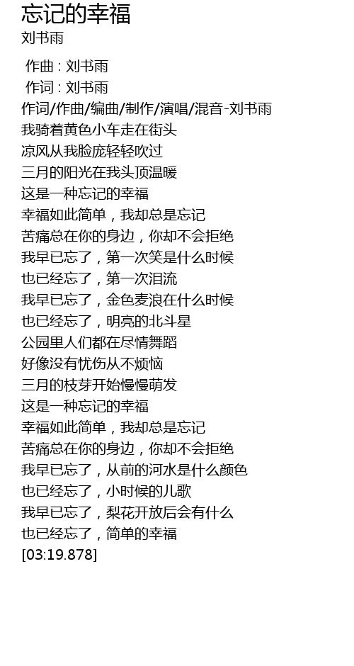 | [03:12.052] | yě yǐ jīng wàng le, jiǎn dān de xìng fú |