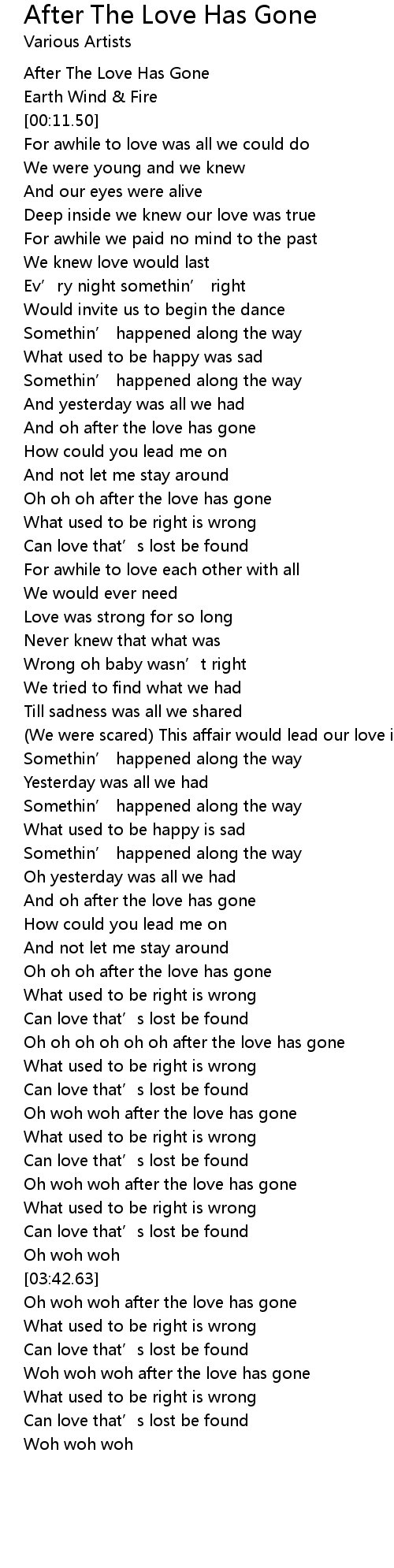 | [02:54.38] | Oh oh oh oh oh oh after the love has gone |