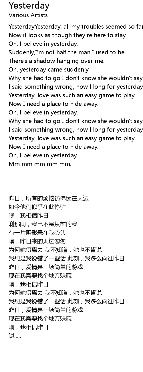 | [00:05.770] | YesterdayYesterday, all my troubles seemed so far away |