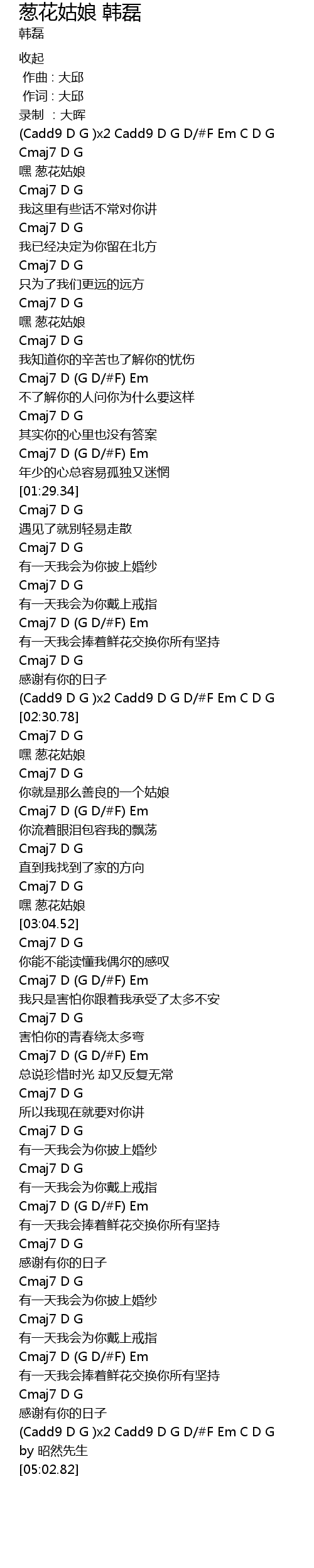 | [02:29.78] | (Cadd9 D G )x2 Cadd9 D G D/#F Em C D G |