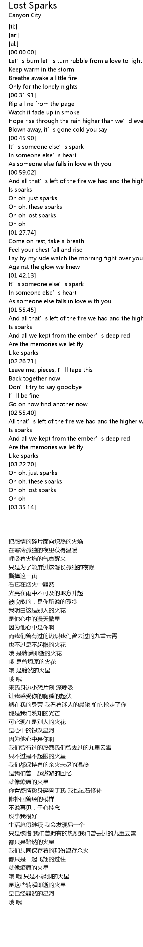 | [00:18.62] | Let' s burn let' s turn rubble from a love to light |