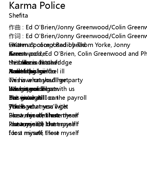 | Karma police Radiohead written composed by Thom Yorke, Jonny Greenwood, Ed O' Brien, Colin Greenwood and Phil Selway Karma police Arrest this man He talks in maths He buzzes like a fridge He' s like a detuned radio Karma police Arrest this girl Her Hitler hairdo Is making me feel ill And we have crashed her party This is what you' ll get This is what you' ll get This is what you' ll get When you mess with us Karma police I' ve given all I can It' s not enough I' ve given all I can But we' re still on the payroll This is what you' ll get This is what you' ll get This is what you' ll get When you mess with us For a minute there I lost myself, I lost myself Phew, for a minute there I lost myself, I lost myself For a minute there I lost myself, I lost myself Phew, for a minute there I lost myself, I lost myself |