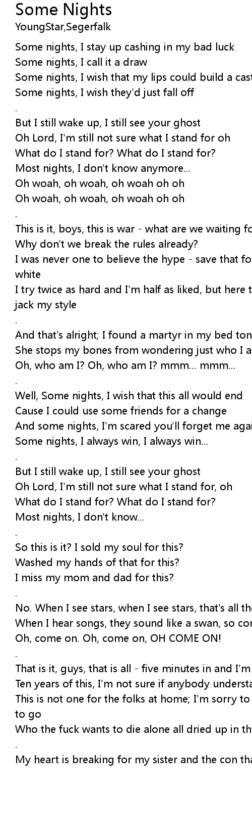 | [00:13.96] | Some nights, I wish they'd just fall off |