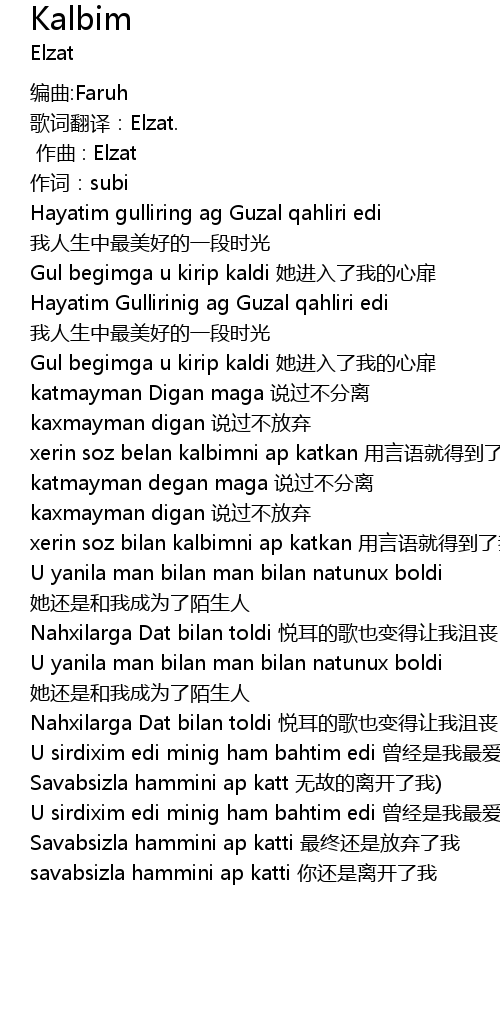 | [02:39.900] | U sirdixim edi minig ham bahtim edi céng jīng shì wǒ zuì ài de rén |