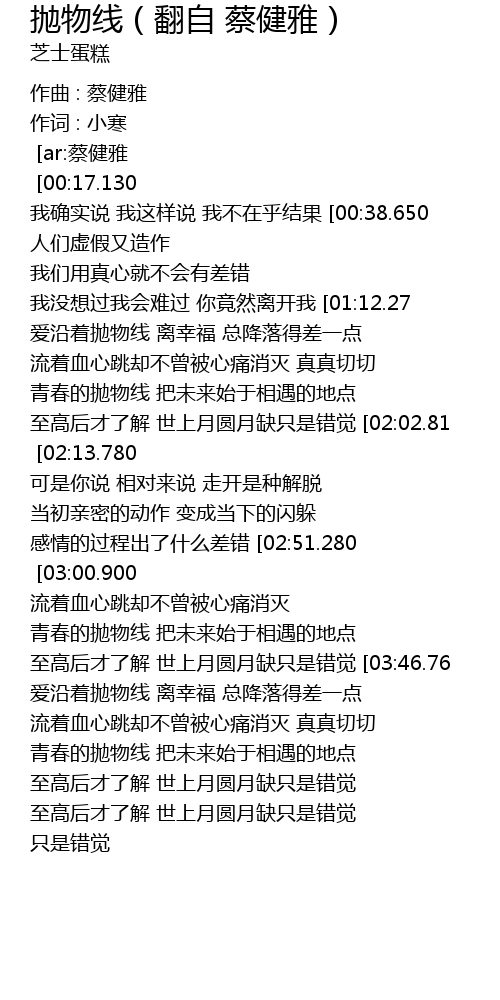 | [00:00.340]蔡健雅 - 抛物线 [00:11.20] [00:17.130]紫.sè制作 [00:22.90] [00:26.430]我确实说 我这样说 我不在乎结果 [00:38.650]我对你说 我有把握 成功例子好多 [00:51.470]人们虚假又造作 总爱得不温不火 [00:58.130]我们用真心就不会有差错 [01:04.200]我没想过我会难过 你竟然离开我 [01:12.27] [01:16.380]爱沿着拋物线 离幸福 总降落得差一点 [01:28.220]流着血心跳却不曾被心痛消灭 真真切切 [01:41.770]青春的拋物线 把未来始于相遇的地点 [01:53.500]至高后才了解 世上月圆月缺只是错觉 [02:02.81] [02:11.16] [02:13.780]我好想说 我只想说 我不要这后果 [02:26.380]可是你说 相对来说 走开是种解脱 [02:39.000]当初亲密的动作 变成当下的闪躲 [02:45.470]感情的过程出了什么差错 [02:51.280]我没想过我会难过 你终于离开我 [02:59.42] [03:00.900]爱沿着拋物线 离幸福 总降落得差一点 [03:12.530]流着血心跳却不曾被心痛消灭 真真切切 [03:25.890]青春的拋物线 把未来始于相遇的地点 [03:37.640]至高后才了解 世上月圆月缺只是错觉 [03:46.76] [03:48.230]爱沿着拋物线 离幸福 总降落得差一点 [04:00.010]流着血心跳却不曾被心痛消灭 真真切切 [04:13.160]青春的拋物线 把未来始于相遇的地点 [04:24.970]至高后才了解 世上月圆月缺只是错觉 [04:37.500]至高后才了解 世上月圆月缺只是错觉 [04:49.070] | ti: pāo wù xiàn ar: cài jiàn yǎ al: ruò nǐ pèng dào tā by: zhǐ shì cuò jué |
