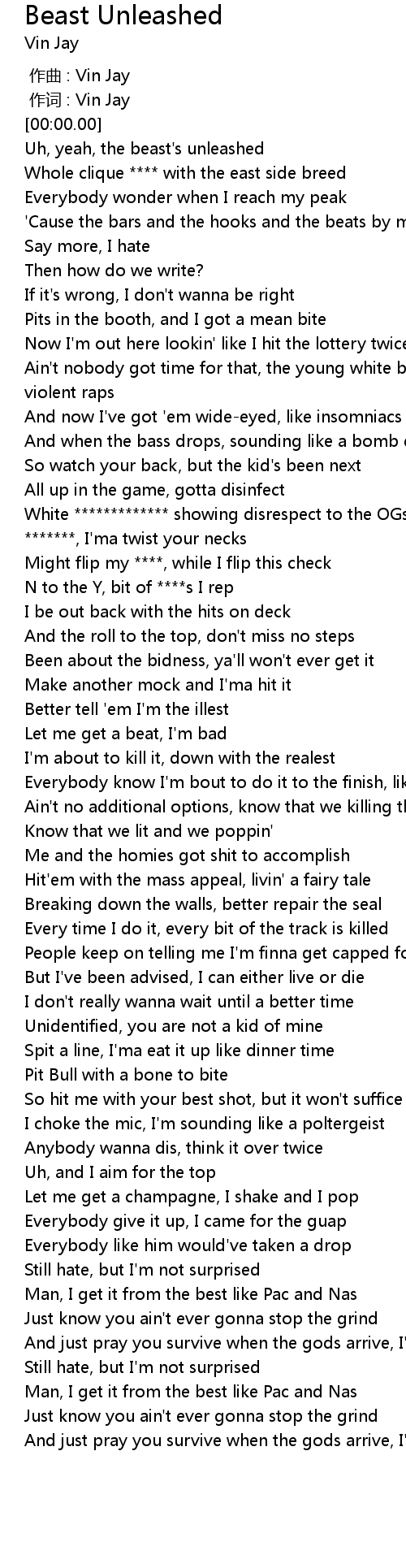 | [00:20.284] | Uh, yeah, the beast' s unleashed |