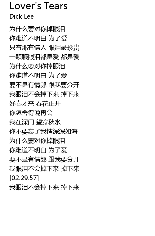 | [02:30.14] | wǒ yǎn lèi bú huì diào xià lái diào xià lái |