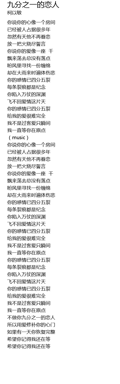 | [03:59.00] | bù zuò nǐ jiǔ fēn zhī yī de liàn rén |