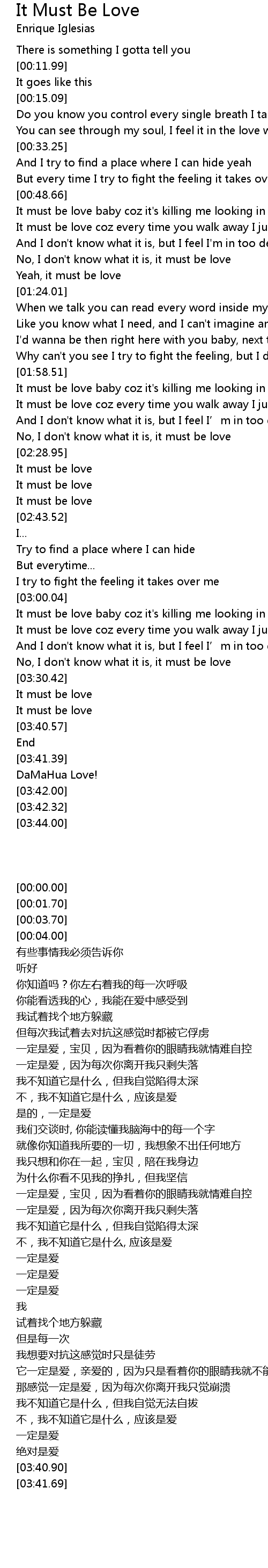 | [02:00.59] | It must be love baby coz it's killing me looking in your eyes |