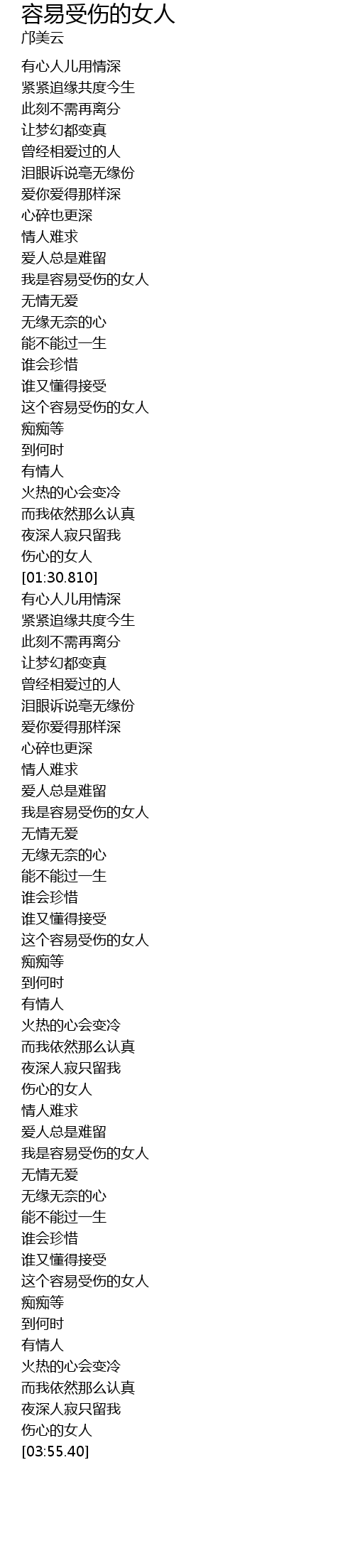 | [02:32.109] | wǒ shì róng yì shòu shāng de nǚ rén |
