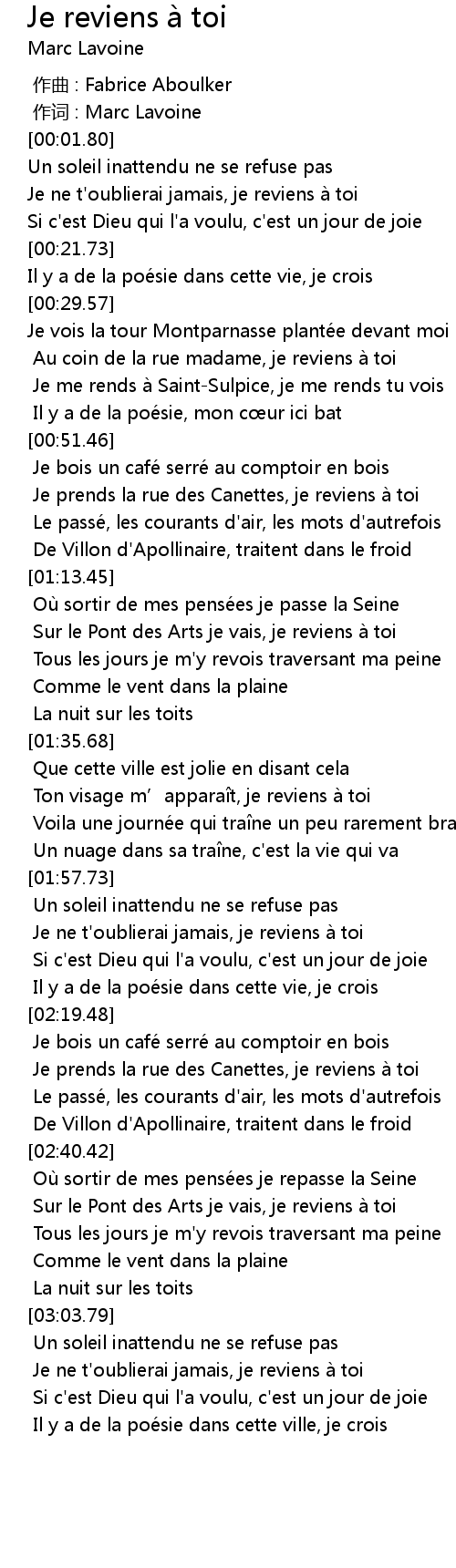 | [00:55.34] | Je prends la rue des Canettes, je reviens à toi |