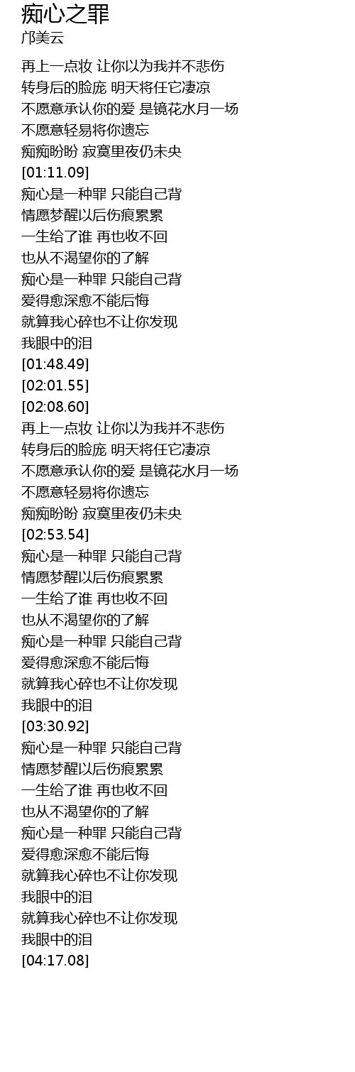 | [01:13.01] | 痴心是一种罪 只能自己背 |