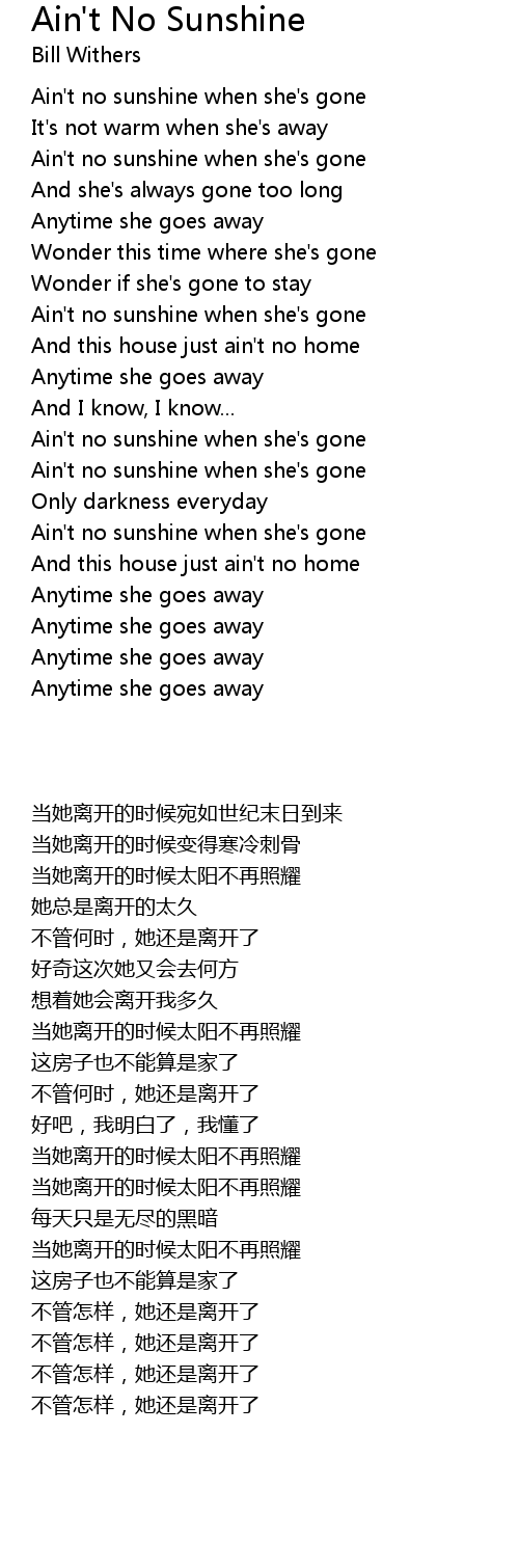 | [00:38.460] | Ain' t no sunshine when she' s gone |