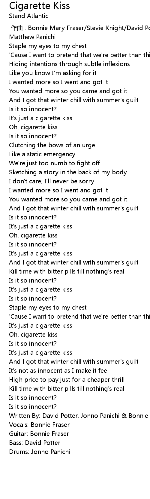 | [00:00.000] | zuo qu : Bonnie Mary Fraser Stevie Knight David Potter Jonathan Matthew Panichi |