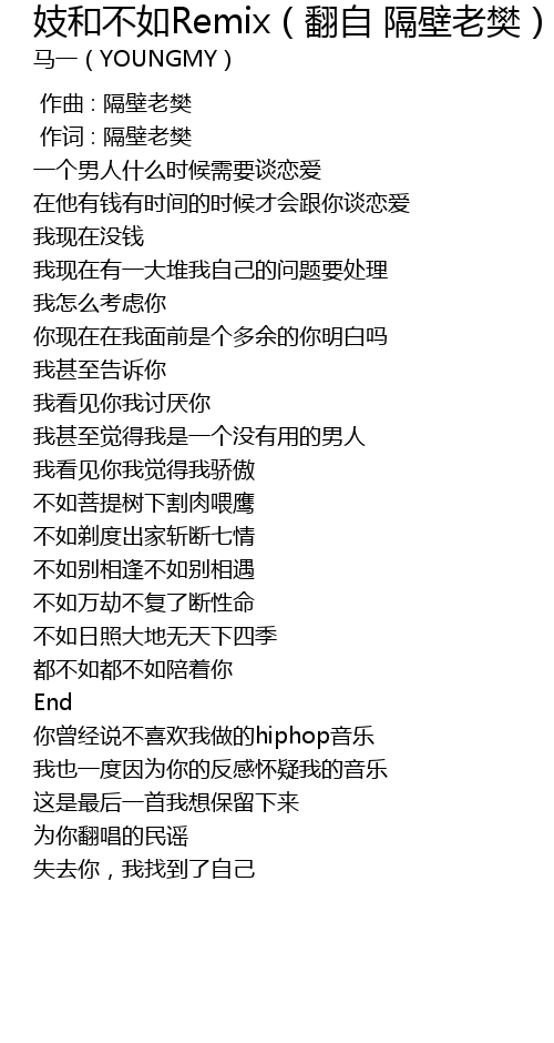 | Song | 妓和不如Remix(翻自 隔壁老樊) |