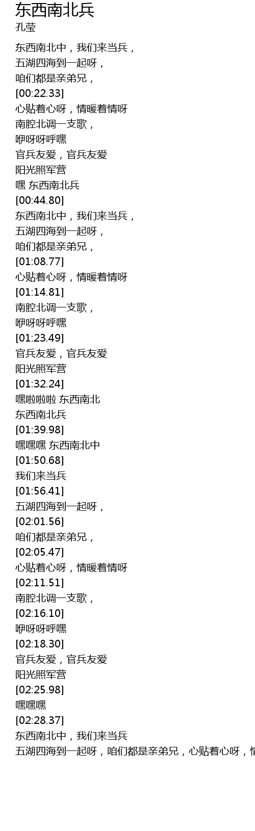 | [02:31.51] | 东西南北中,我们来当兵 五湖四海到一起呀,咱们都是亲弟兄,心贴着心呀,情暖着情呀,南腔北调一支歌,咿呀呀呼嘿,官兵友爱,官兵友爱,阳光照军营,嘿嘿嘿,东西南北兵 |