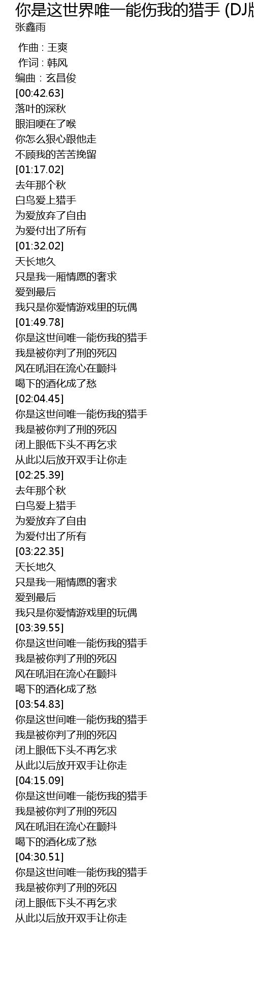 | [04:16.07] | 你是这世间唯一能伤我的猎手 |