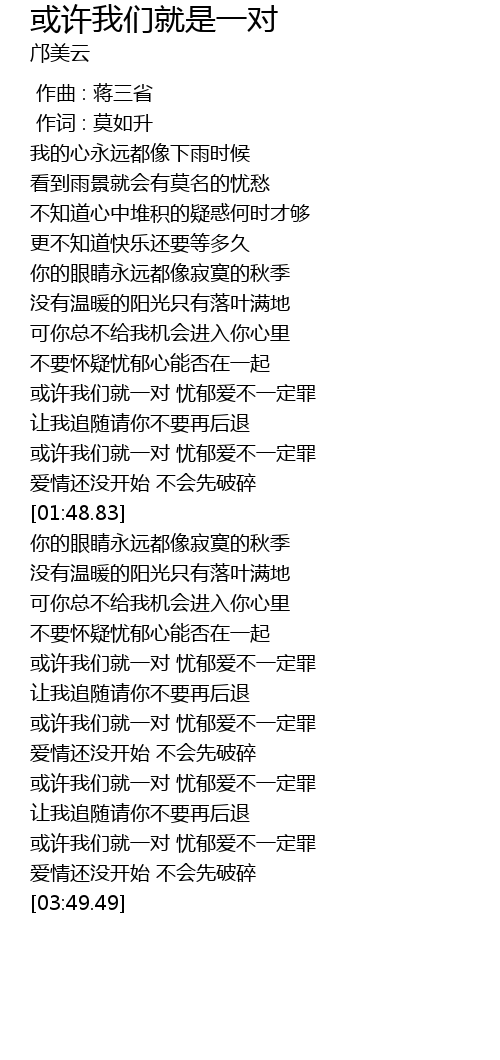 | [03:03.38] | 或许我们就一对 忧郁爱不一定罪 |