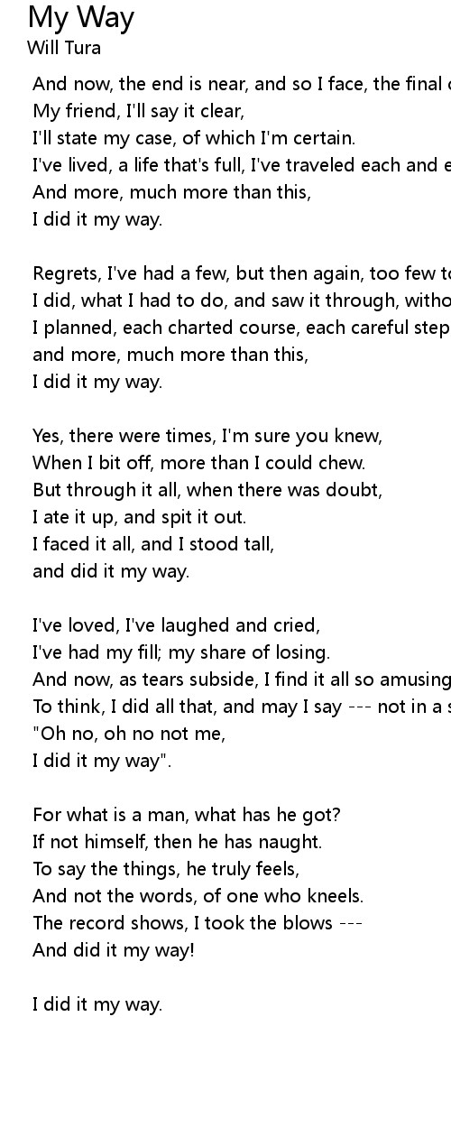 | I' ve lived, a life that' s full, I' ve traveled each and every highway. | |