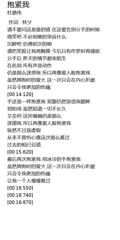 | [00:14.860] | 迷锶我 所以再像爱人般抱紧我 |