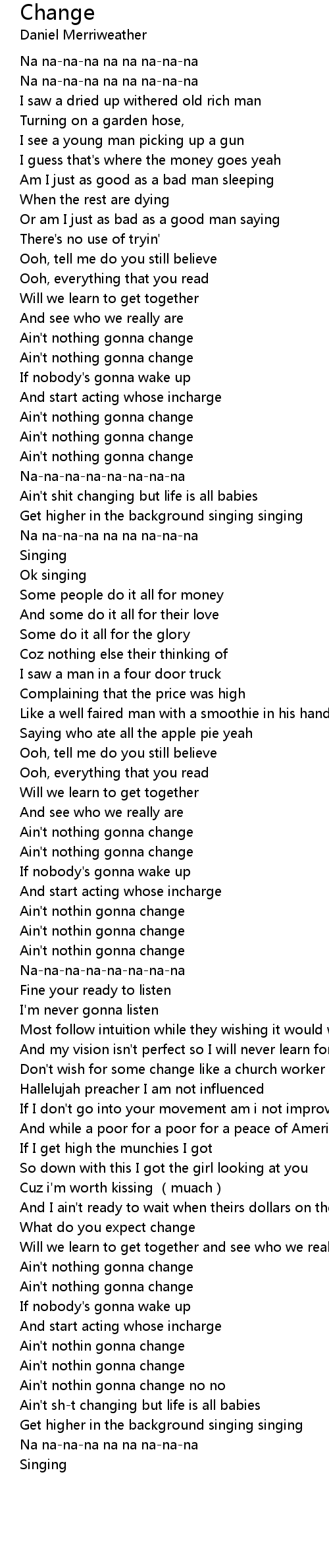 | [03:06.999] | Ain' t nothin gonna change no no |