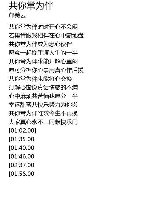 | [02:31.00][01:46.00] | 共你常为伴成为终身伙伴 |