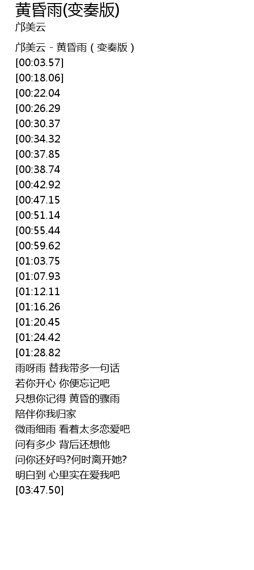 | [00:00.00] | 邝美云 - 黄昏雨(变奏版) |