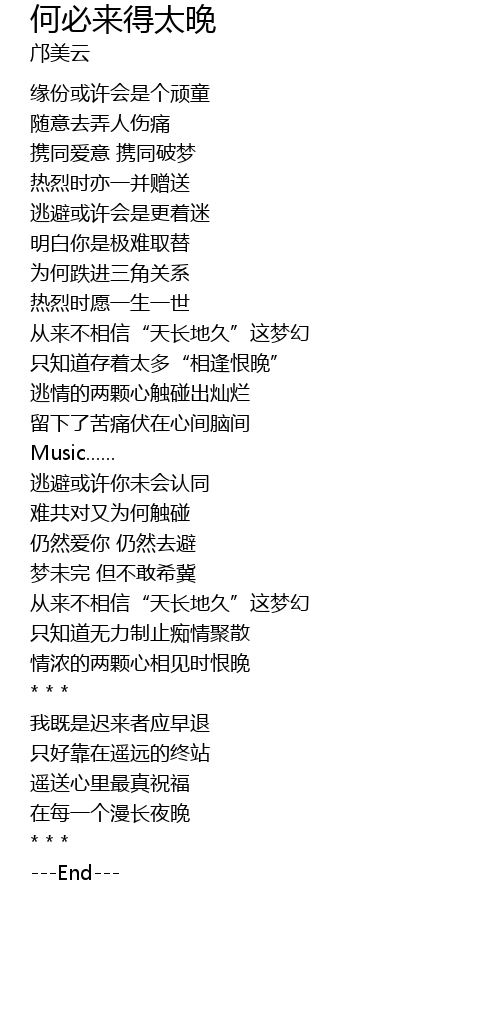 | [02:40.390] | 从来不相信“天长地久”这梦幻 |