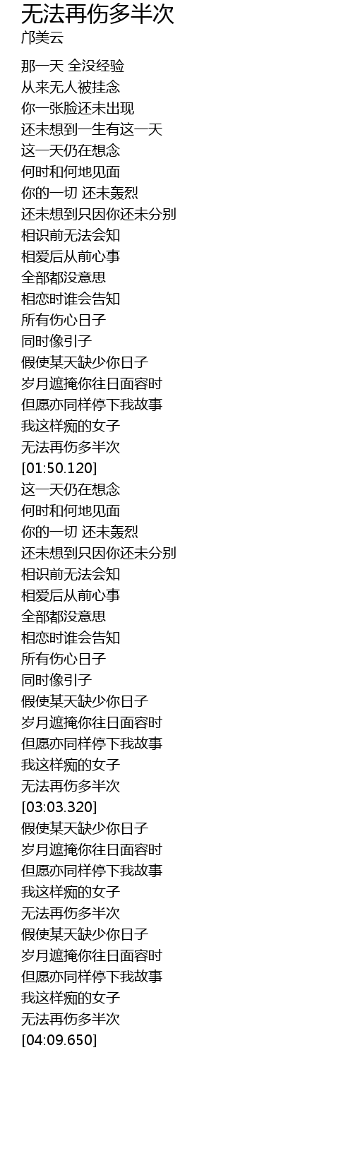 | [04:02.650] | wú fǎ zài shāng duō bàn cì |