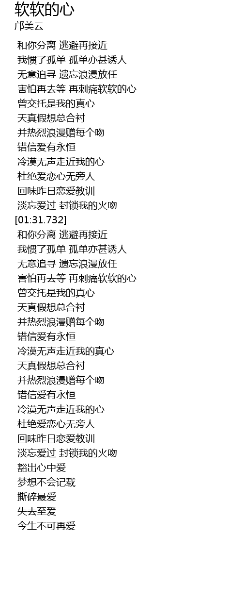| [00:42.165] | hai pa zai qu deng zai ci tong ruan ruan de xin |