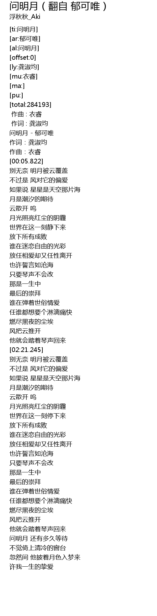 | [04:00.387] | 问明月 还有多久等待 |