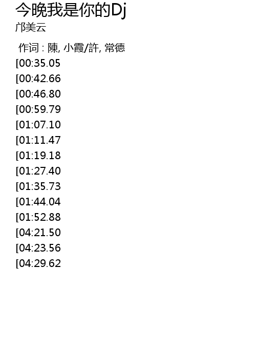 | [03:56.53][01:35.73] | 今晚 只有今晚 我是你的DJ |