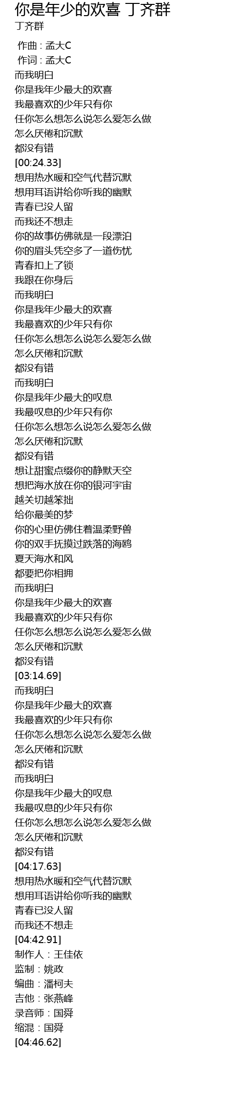 | [00:02.57] | nǐ shì wǒ nián shào zuì dà de huān xǐ |