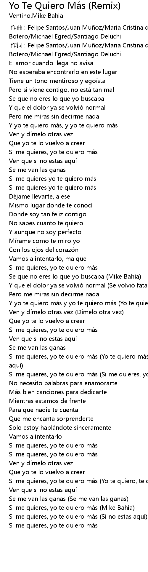 | [02:37.85] | Si me quieres, yo te quiero más (Yo te quiero, te quiero, te quiero) |
