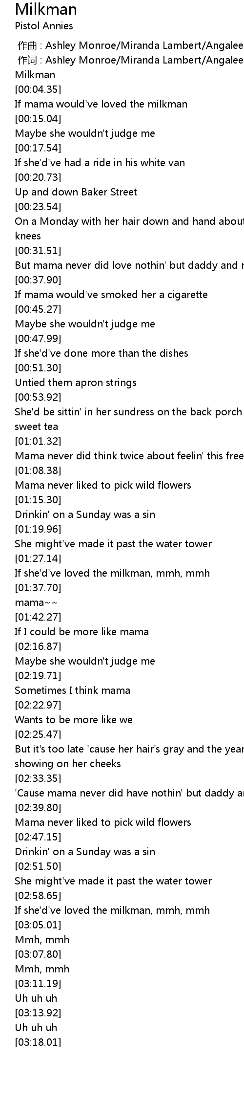 | [01:27.22] | If she'd've loved the milkman, mmh, mmh |