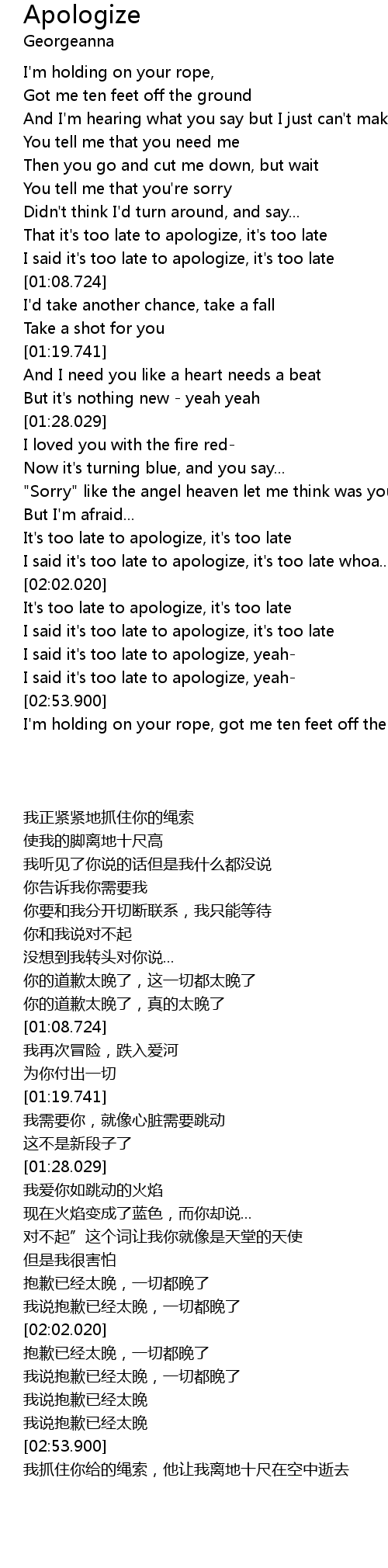 | [00:49.287] | That it' s too late to apologize, it' s too late |