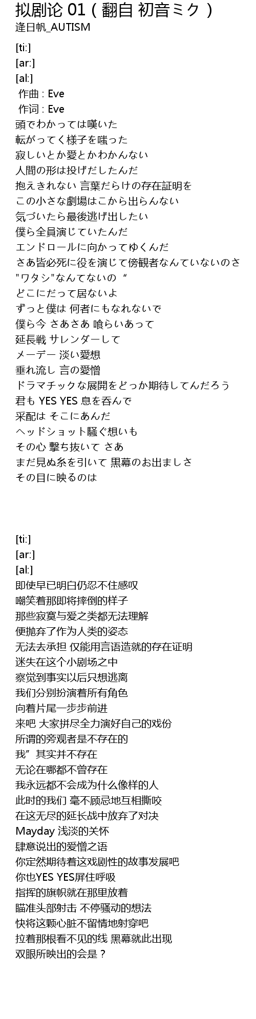 | Song | 拟剧论 01(翻自 初音ミク) |