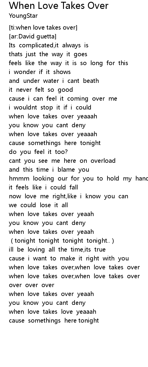 | [02:08.684] | when love takes over, when love takes over |