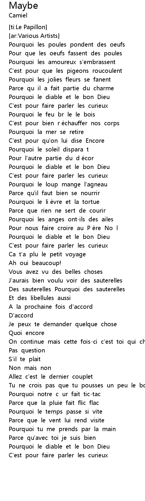| [00:46.38] | Pourquoi le feu br le le bois |