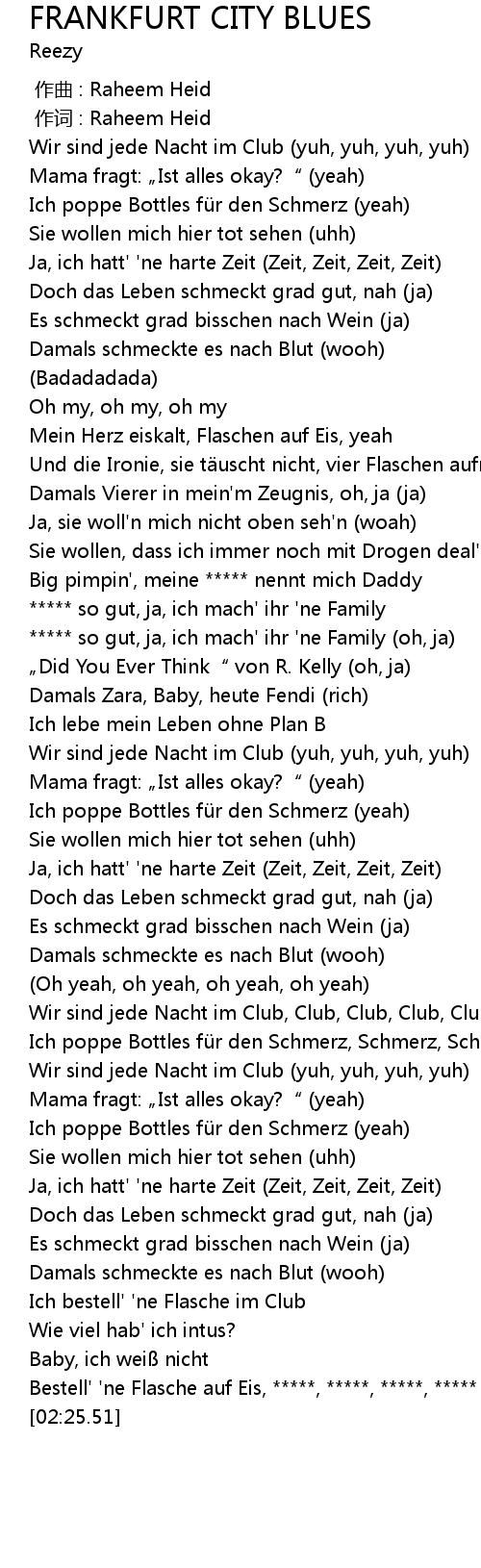 | [01:06.33] | Wir sind jede Nacht im Club (yuh, yuh, yuh, yuh) |