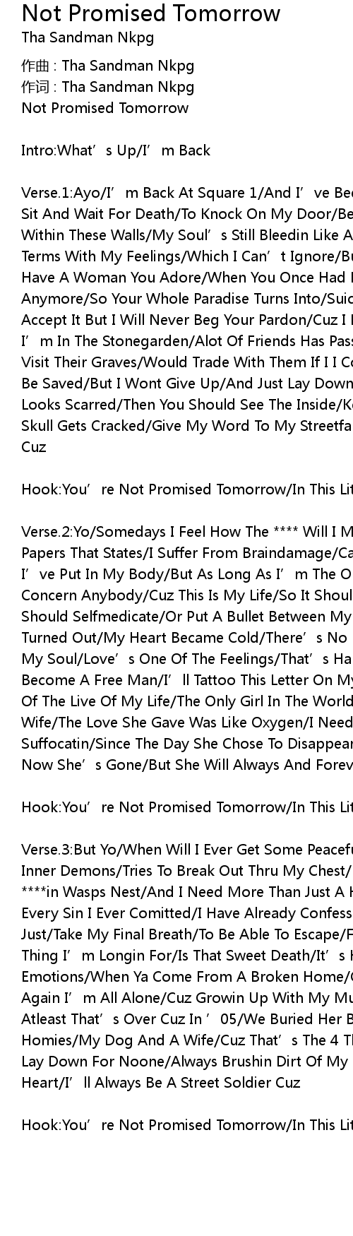 | Verse.3:But Yo/When Will I Ever Get Some Peaceful Rest/When It Feels Like All My Inner Demons/Tries To Break Out Thru My Chest/My Head Is Always Buzzin Like A ****in Wasps Nest/And I Need More Than Just A Hail Mary/To Feel Blessed/But Every Sin I Ever Comitted/I Have Already Confessed/So All I Wanna Do Now Is Just/Take My Final Breath/To Be Able To Escape/From All This Stress/The Only Thing I’m Longin For/Is That Sweet Death/It’s Hard To Deal With Emotions/When Ya Come From A Broken Home/Cuz Just Like When I Was A Kid/Once Again I’m All Alone/Cuz Growin Up With My Mum/Was Like The Twilight Zone/But Atleast That’s Over Cuz In ’05/We Buried Her Bones/I Miss My Seeds/My Homies/My Dog And A Wife/Cuz That’s The 4 Things That/Fullfill My Life/But I Lay Down For Noone/Always Brushin Dirt Of My Shoulder/I Promise And Cross My Heart/I’ll Always Be A Street Soldier Cuz | |