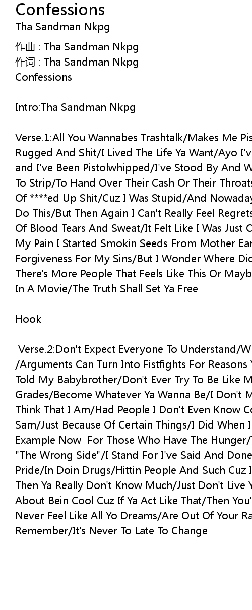 | Verse. 1: All You Wannabes Trashtalk Makes Me Pissed Cuz Ya Try To Be Hardcore Rugged And Shit I Lived The Life Ya Want Ayo I' ve Taken Hits From Baseballbats and I' ve Been Pistolwhipped I' ve Stood By And Watched As Strangers Got Ordered To Strip To Hand Over Their Cash Or Their Throats Would Get Slit I' ve Done Alot Of ed Up Shit Cuz I Was Stupid And Nowadays I Ask Myself: Why The Did I Do This But Then Again I Can' t Really Feel Regrets Cuz For This Life I Shed Alot Of Blood Tears And Sweat It Felt Like I Was Just Cursed Since Birth So To Ease My Pain I Started Smokin Seeds From Mother Earth I' ve Never Asked A Priest For Forgiveness For My Sins But I Wonder Where Did All The Madness Begin Maybe There' s More People That Feels Like This Or Maybe It' s Just Me Like Someone Said In A Movie The Truth Shall Set Ya Free | |