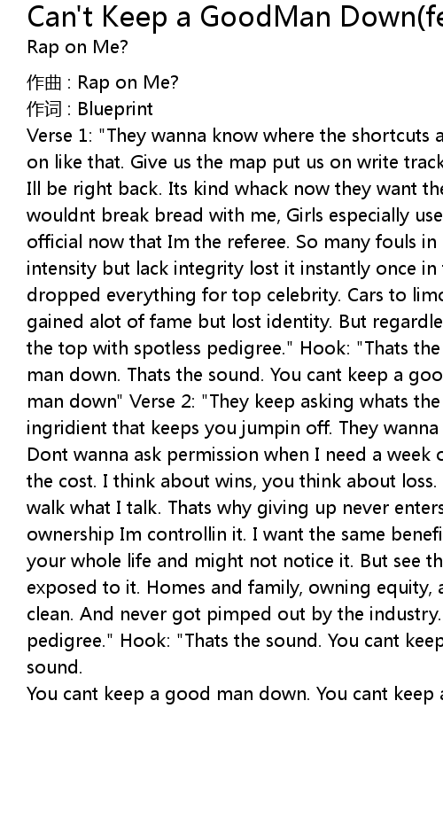 | Verse 1: " They wanna know where the shortcuts at. Tell us how you got it going on like that. Give us the map put us on write track. Lemme hold something bro Ill be right back. Its kind whack now they want the recipe but couple years back wouldnt break bread with me, Girls especially used to play games with me. Im so official now that Im the referee. So many fouls in everything I see they have intensity but lack integrity lost it instantly once in the industry. They dropped everything for top celebrity. Cars to limosines, blogs to magazines gained alot of fame but lost identity. But regardless im still living clean on the top with spotless pedigree." Hook: " Thats the sound. You cant keep a good man down. Thats the sound. You cant keep a good man down. You cant keep a good man down" Verse 2: " They keep asking whats the special sauce. The secret ingridient that keeps you jumpin off. They wanna be workers. I wanna be a boss. Dont wanna ask permission when I need a week off. Freedom aint free I believe in the cost. I think about wins, you think about loss. You talk just to talk. I walk what I talk. Thats why giving up never enters my thoughts. Pride and ownership Im controllin it. I want the same benefits that the owner gets. Go your whole life and might not notice it. But see the big picture once you get exposed to it. Homes and family, owning equity, awesome legacy, all from living clean. And never got pimped out by the industry. Still on top with a spotless pedigree." Hook: " Thats the sound. You cant keep a good man down. Thats the sound. | |