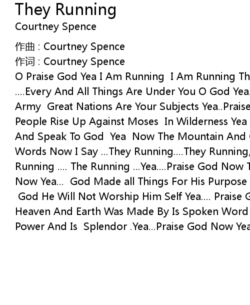 | O Praise God Yea I Am Running I Am Running They Running O God Yea... Yeah ....Every And All Things Are Under You O God Yea.. Praise God Now Yea ... Many Army Great Nations Are Your Subjects Yea..Praise God Now.. Yea...All the People Rise Up Against Moses In Wilderness Yea ...Moses Said Go To Foot Hills And Speak To God Yea Now The Mountain And Ground Start To Quake By Is Mighty Words Now I Say ...They Running....They Running,... They Running .. They Running .... The Running ...Yea....Praise God Now They Running ....Praise God Now Yea... God Made all Things For His Purpose Yea O God Yea... We Must Worship God He Will Not Worship Him Self Yea.... Praise God Yea Now O God Yea.. Heaven And Earth Was Made By Is Spoken Word O God Yea Who Can Stand Before Is Power And Is Splendor .Yea...Praise God Now Yea.... |