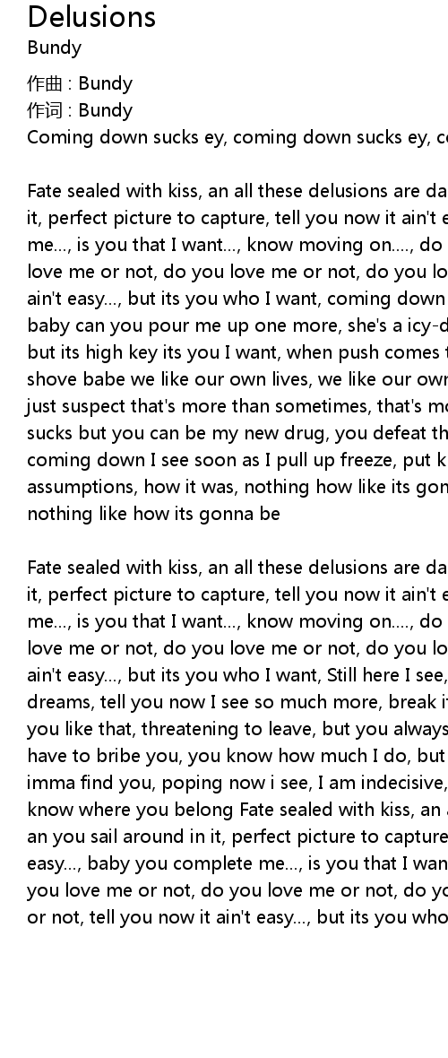 | Fate sealed with kiss, an all these delusions are daggers, an you sail around in it, perfect picture to capture, tell you now it ain't easy..., baby you complete me..., is you that I want..., know moving on...., do you love me or not, do you love me or not, do you love me or not, do you love me or not, tell you now it ain't easy..., but its you who I want, coming down I see diamonds docy doen, baby can you pour me up one more, she's a icy-diddy, studied Aphrodite, low key but its high key its you I want, when push comes to shove babe, push comes to shove babe we like our own lives, we like our own lives its just suspect, its just suspect that's more than sometimes, that's more than sometimes coming down sucks but you can be my new drug, you defeat the purpose of rolling one more, coming down I see soon as I pull up freeze, put knowone above me don't give into assumptions, how it was, nothing how like its gonna be, yeah how it was..., nothing like how its gonna be | |
